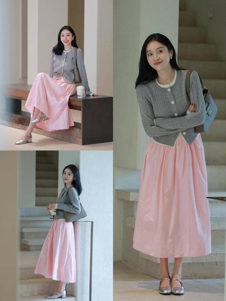 偏爱俏皮少女感,直接选择一条粉色的散装半身裙,配上灰色针织开衫,内搭白色打底衫,脚踩银灰色粗跟单鞋,这样的穿衣造型少女气息 4 线,不用刻意装嫩,就能让你显年轻。