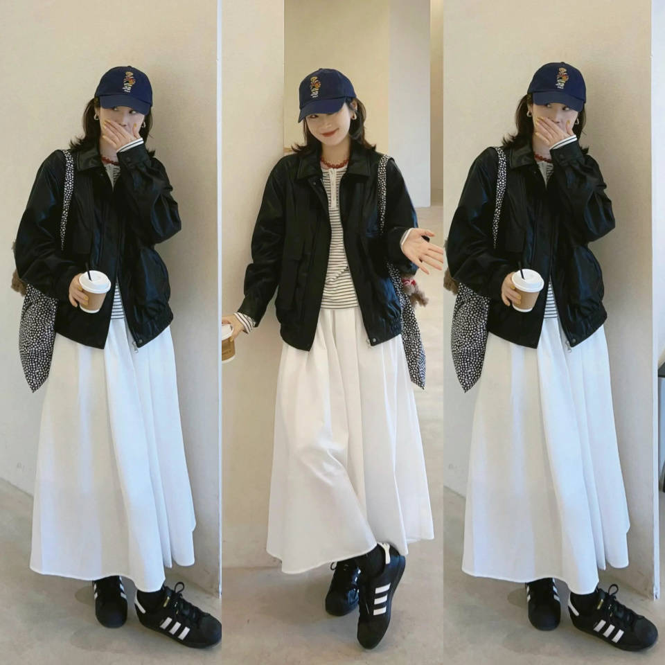 气质不同,个子不同,穿出来的效果也完全不一样若是小个子女生穿了一件黑色皮衣外套,内搭条纹衫和一条白色伞裙,脚踩一双黑色德训鞋。这样的穿搭带着利落感但又添增了少女的气息,可盐可甜。