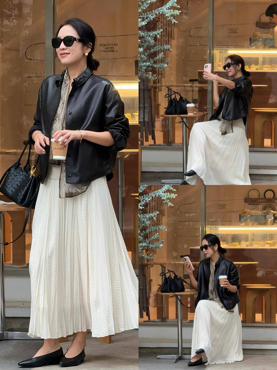 Tips①:黑色皮衣+白色伞裙