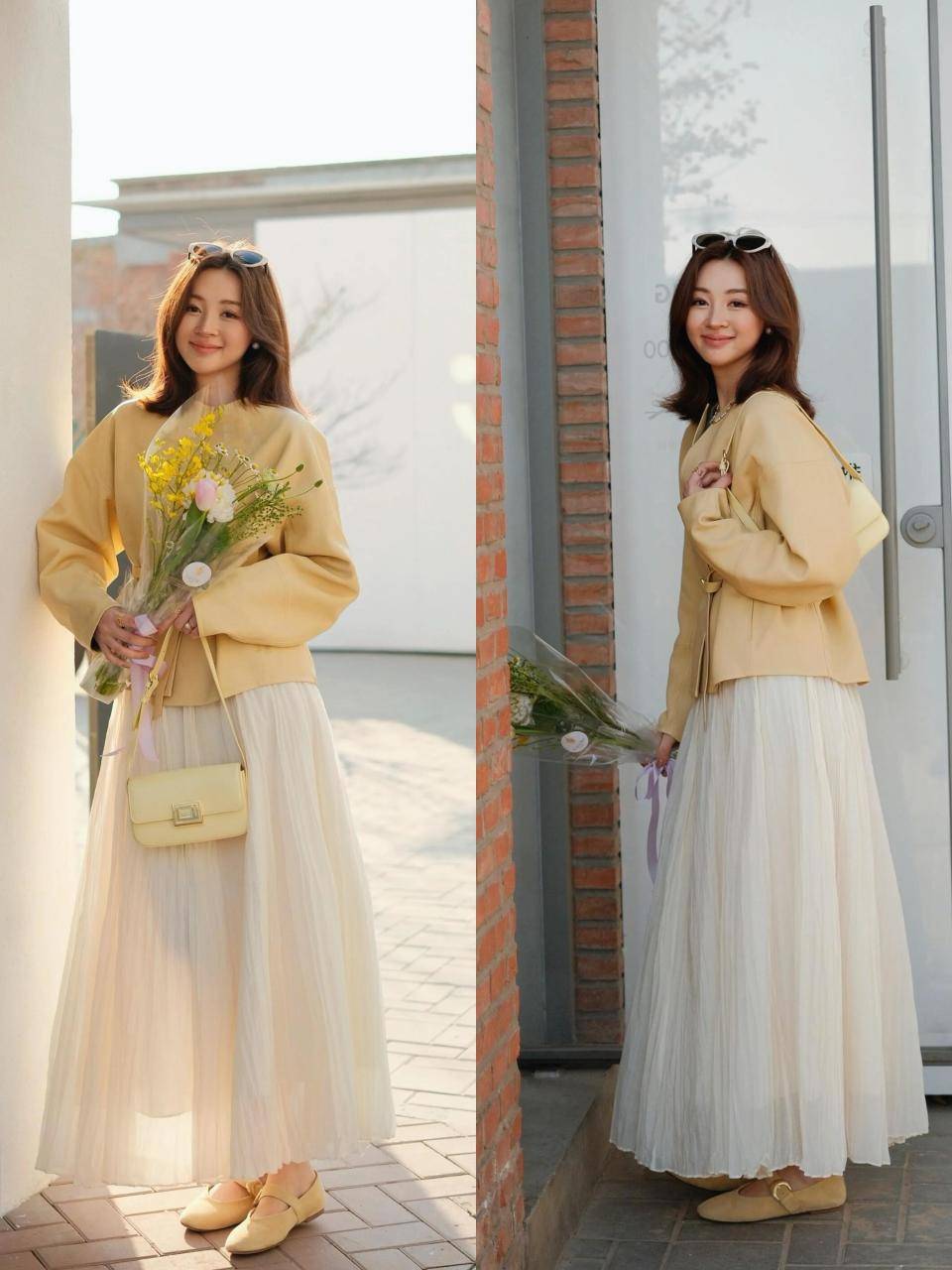 Tips②:卡其黄皮衣外套+白色伞裙