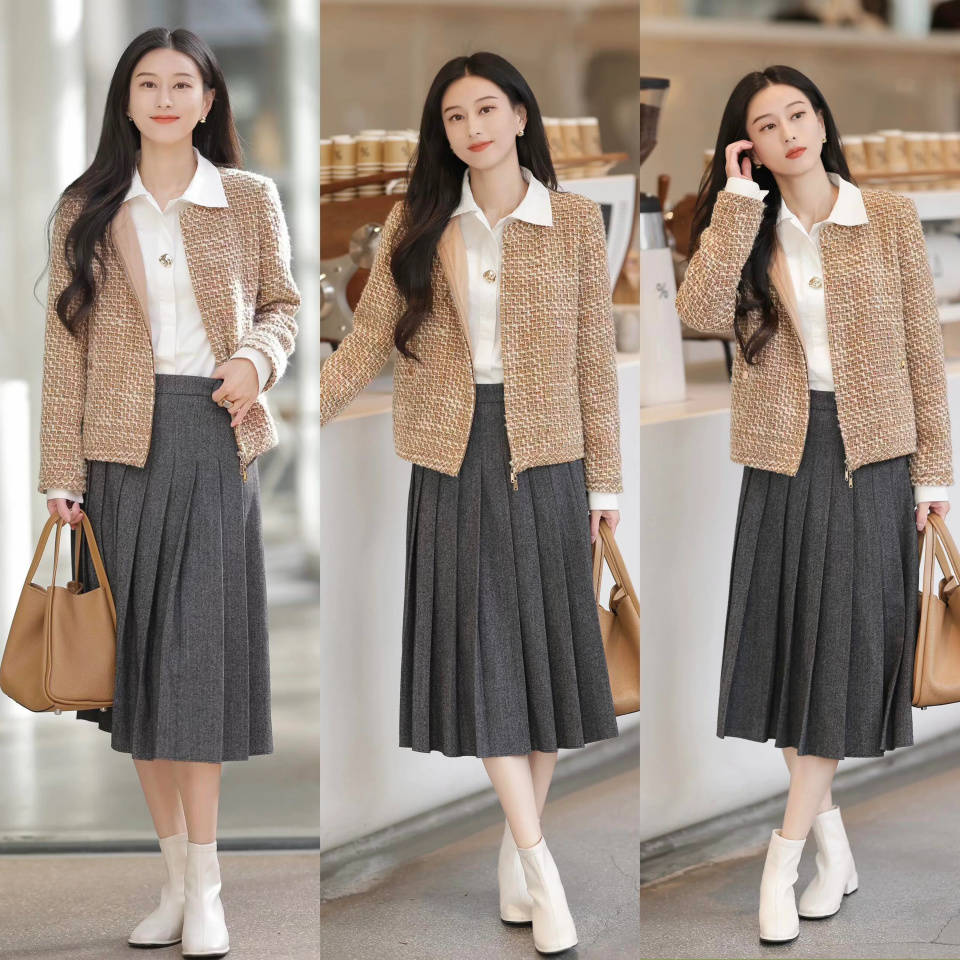 小香风外套色彩多种多样,一个小细节的差距穿出来也有不一样的美。例如上面用美拉德色系的小香风外套,内搭白衬衫和一条比较有质感的高腰收腰压褶半裙,脚踩白色短靴,这样的穿搭精致洋气,经得起潮流更迭。