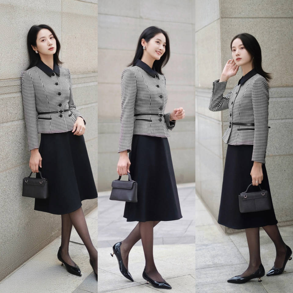 偏爱轻熟风的穿衣造型,可选一件最基础的灰色格纹小香风外套,内搭黑色衬衫,再配上黑色的伞裙,脚踩黑色浅口单鞋,穿的时候在腰间系上黑色细腰带,形成高腰线,使得身材变成三七分,高贵典雅,走起路来从容又大气。