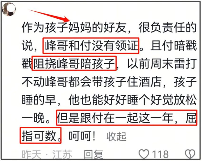 一位自称是张老师前妻的好友爆料,张老师和现任付某并没有领证,并透露付某暗戳戳阻挠张老师陪孩子。张老师以前每周末都去陪孩子,带着孩子住酒店,孩子休息得早,他也能早休息。但和付某在一起这一年里,陪孩子的次数“屈指可数”。