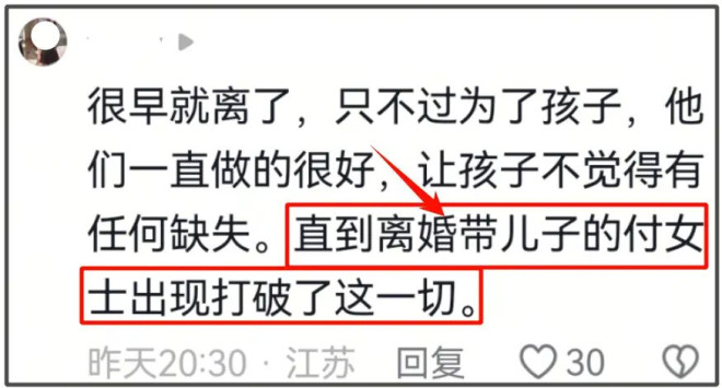 好友称张老师和前妻很早就离婚了,但为了孩子,两人一直都做得很好,让孩子不觉得有任何缺失,直到离婚带儿子的付某出现,“打破了这一切”。