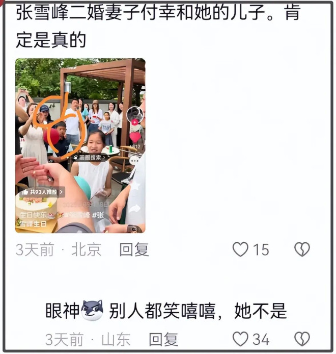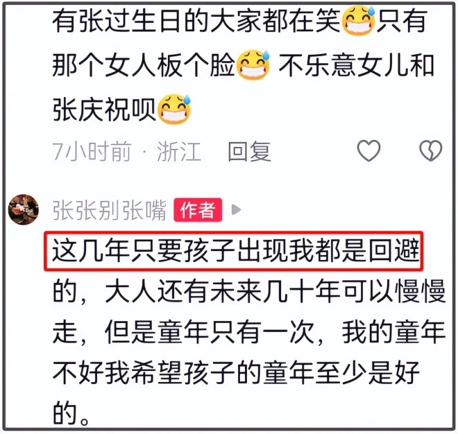 有网友吐槽付某在张老师生日宴上太高调,还疑似带自己儿子现身,表情也不太好。张老师前女友张张则回应称自己一直很低调,恋爱期间有孩子的场合都回避,不想让孩子童年不快乐。
