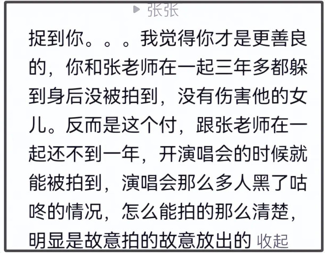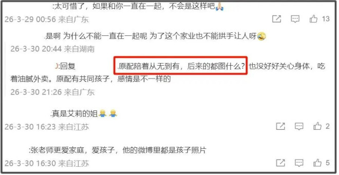 人吧,就怕对比。一个是低调谈了3年,还照顾病重老人的前女友;一个是刚谈不久,就被偶遇看演唱会,被迫公开的现任,网友的心也会有所偏向。更别说给张老师生儿育女,陪他从低谷一路走来的原配了。
