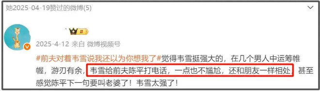 两人离婚之后,前妻也曾点赞过韦雪和前任相处像朋友的直播切片,对于离婚一事很看得开,评论区网友对原配的评价也很高。