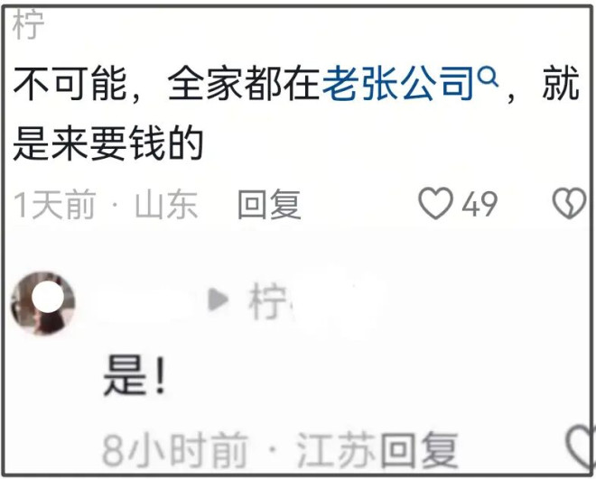 不得不说,张老师去世到现在,有关张老师现任付某的负面爆料还真不少,网友爆料付某全家都在张老师公司,“就是来要钱的”,好友疑似回复“是!”