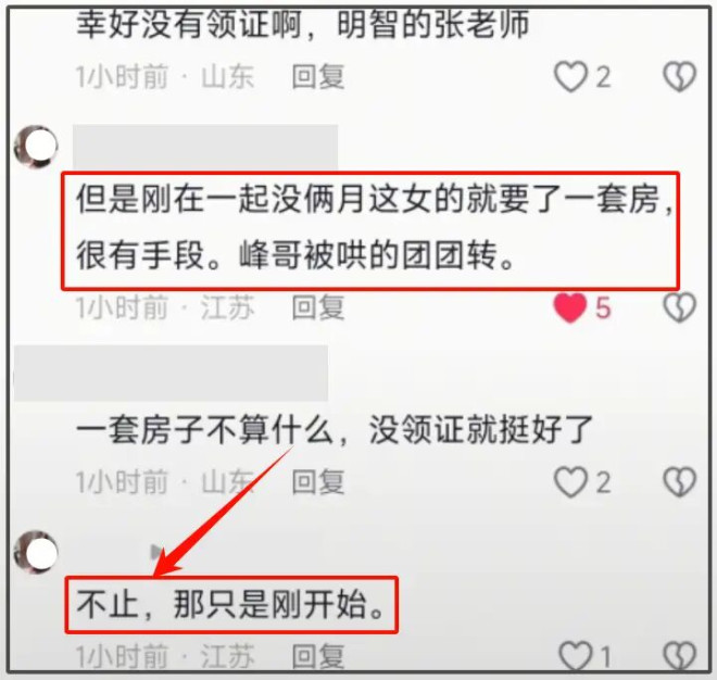 好友还爆料,女方刚和张老师在一起不久,就要了一套房。“很有手段,峰哥被哄的团团转”,更直言不止一套房,“那只是刚开始”。