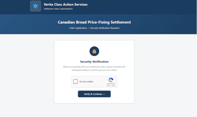CBC News点击Haddock收到的链接,查看了一个仿冒网站,声称来自“Verita Class Action Services”。该网站提供了集体诉讼背景信息,并引导用户填写表格领取预定金额。