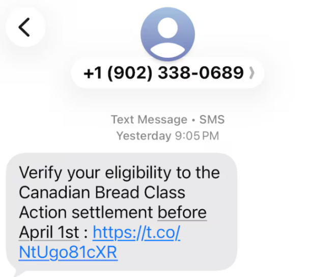 上周日,当Elizabeth Haddock收到一条短信,提示她“在4月1日前验证自己是否有资格参与‘加拿大面包集体诉讼和解’”时,她起了疑心。