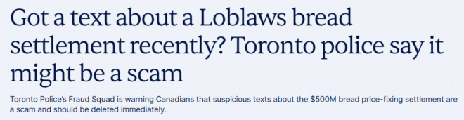 Haddock是周末向CBC News报告收到类似短信的两人之一,这些短信都涉及价值5亿加元的集体诉讼和解,针对整个面包行业的价格操纵,表明这些短信可能是诈骗。