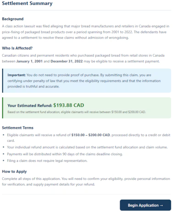 任何在2001年至2021年间为个人使用购买过包装面包的加拿大居民,都有资格从与Loblaw Companies Ltd.及其母公司George Weston Ltd.达成的全国和解中索赔。索赔流程自2025年9月11日开始,并于12月12日关闭。合法网站canadianbreadsettlement.ca指出,现在无法再提交索赔。