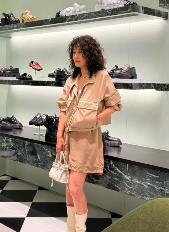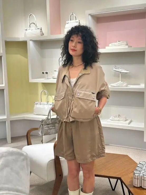 一头“爆炸”的卷发,工装风的短裤套装,搭配白色短靴,穿出了一股上世纪90年代复古、摩登的风格。