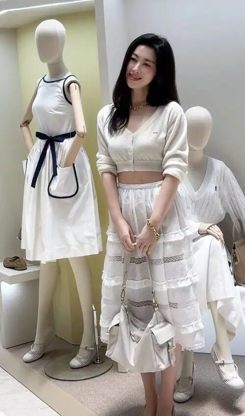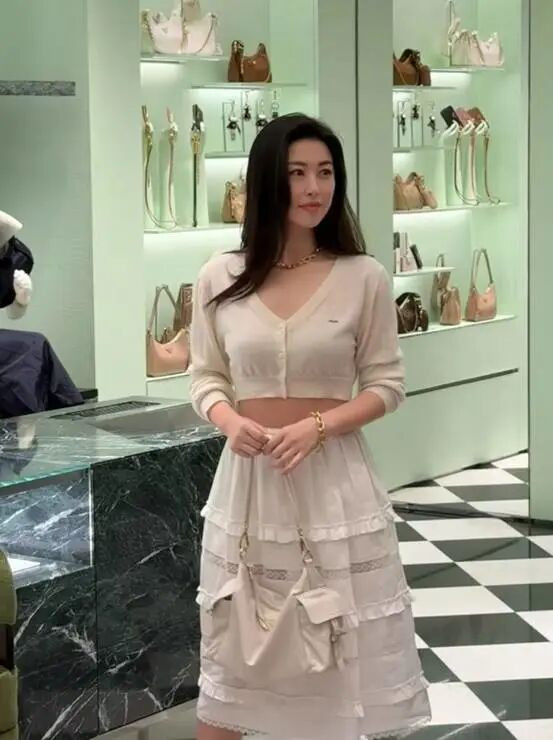 针织衫搭配白色长裙,露腰的设计凸显身材曲线,优雅端庄、清新脱俗,笑起来更是让人感觉到如沐春风。