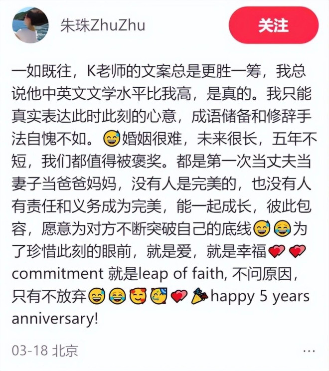 朱珠在她结婚五周年的纪念日时,还分享了一家三口的合照,以及自己的感悟,字里行间都是溢出来的幸福。