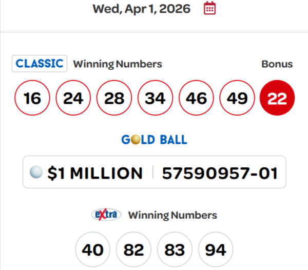 下一期 Lotto 6/49 彩票将于 4 月 4 日星期六开奖,金球奖金现价值 2200 万加元。