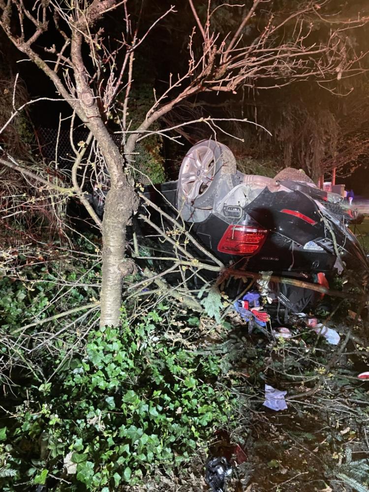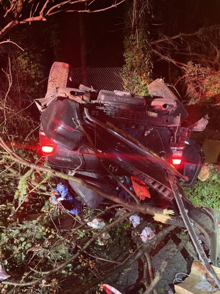 NWPD称,其中一辆车当时车速过快,翻入附近树篱,车顶朝下。