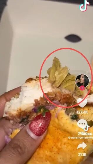这位博主名叫Paris Mars(@parisfromtoronto)。她在视频中展示称,她在位于Pickering的一家Dave’s Hot Chicken门店购买的炸鸡汉堡中,竟然夹着一块明显变色的绿色肉块。