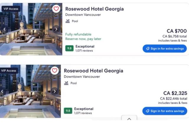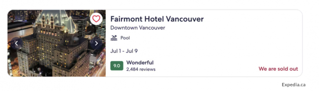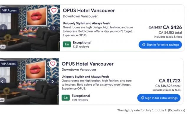 Daily Hive查阅发现,4月入住温哥华市中心的OPUS酒店,每晚价格$426元。然而,到了7月1日至9日,同一房型房价暴涨至$1723元一晚。