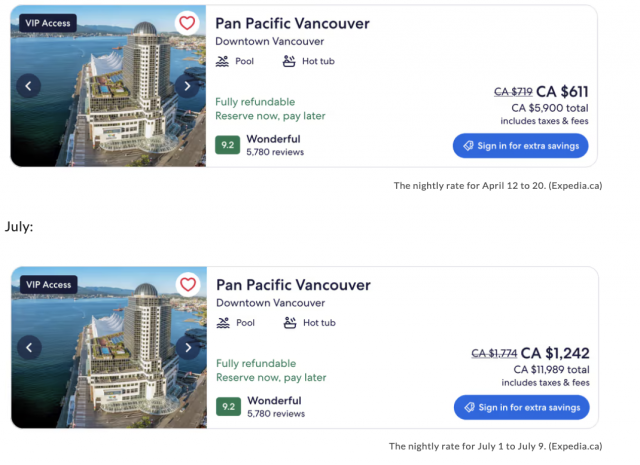 The Pan Pacific Vancouver酒店4月价格是$611元一晚,7月价格为$1242元一晚。
