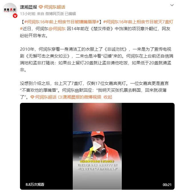 没想到介绍之后,台上灭了7盏灯,仅剩17位女嘉宾亮灯。一位女嘉宾更是直言“不喜欢他的厚嘴唇”。何润东幽默回应:“我明天买张机票去韩国,回来就很薄了”。