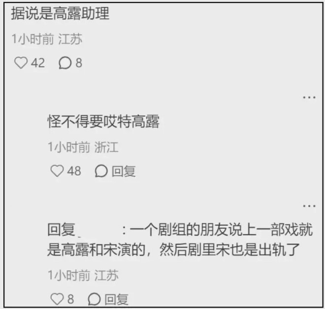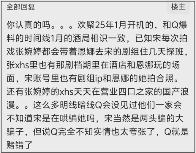 根据网友扒出的时间线,宋宁峰2025年进了一个名为《欢聚》的剧组,和高露饰演一对夫妻,作为高露的助理,Q女士也在。《欢聚》是2025年1月份在浙江开机,也就是说宋宁峰刚进组就盯上了别人家20多岁的女助理(Q女士)。