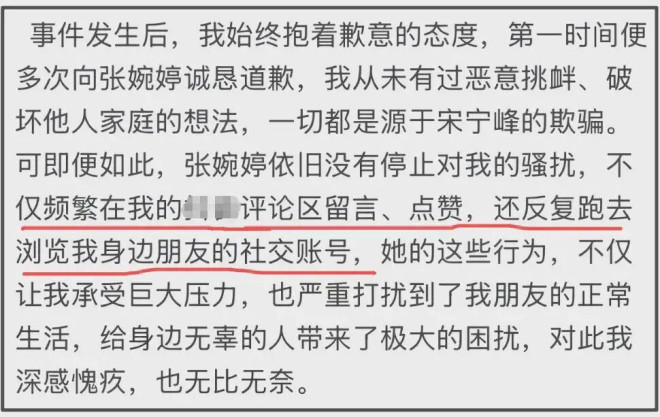 只不过比起宋宁峰,Q女士明显对宋宁峰妻子张婉婷更有情绪,强调自己和张婉婷多次道歉,但张婉婷还是不肯放过她,一边用曝光私密照片威胁,一边去Q女士社媒点赞留言,还会浏览Q女士朋友账号。