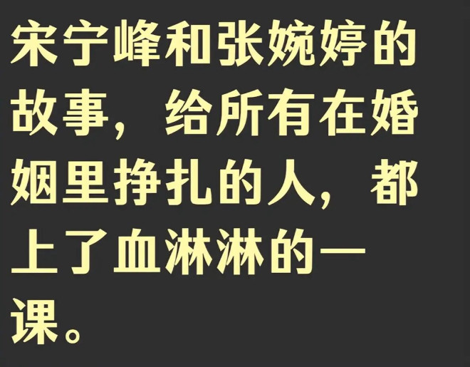 永远不要用新婚姻治愈旧伤,避免通过控制留住不爱你的人,宋宁峰和张婉婷的婚姻问题,这几天闹的很厉害了,但是从现在的舆论发酵情况上来看,张婉婷,也没得到多少人的同情。