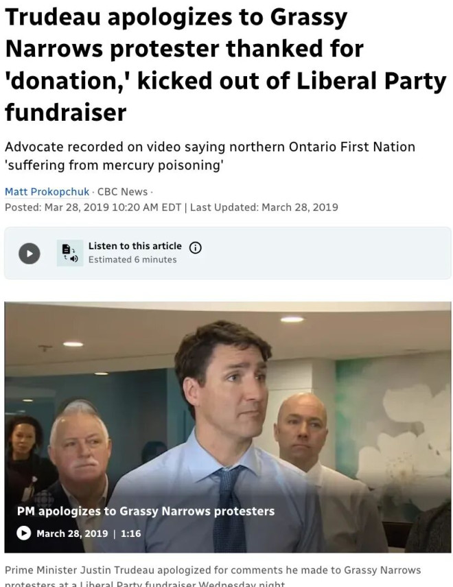 2019年,一场自由党筹款活动上,一名支持Grassy Narrows的抗议者突然打断活动,表达对汞污染问题的关注。结果特鲁多当场回应了一句:“感谢你们的捐款。”