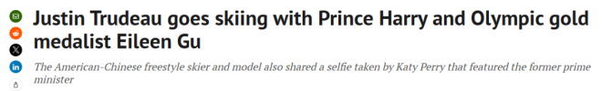 奥运冠军谷爱凌(Eileen Gu)本周在社交媒体上分享了一张照片,画面中加拿大前总理特鲁多(Justin Trudeau)和英国哈里王子(Prince Harry)一起坐在滑雪缆车上。