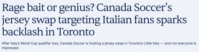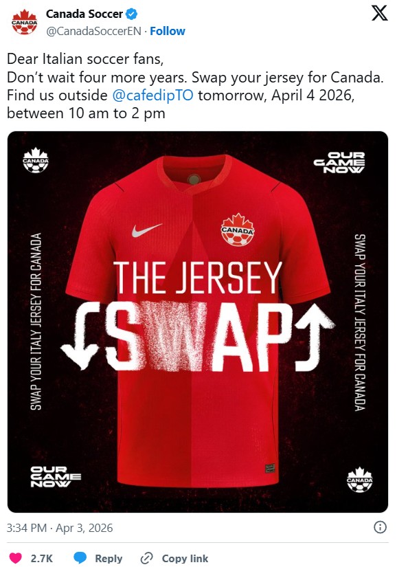 本周,在即将到来的世界杯预选赛中,意大利国家足球队输给了波黑国家足球队,遗憾出局。趁这个时机,加拿大足协(Canada Soccer)向多伦多的意大利球迷发出邀请,希望他们转而支持加拿大队。