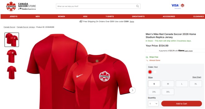 加拿大队为2026世界杯推出的新球衣已在3月中旬正式发布。这次现场免费发放的是没有印名字的球迷版球衣,网上售价为134.99加元。