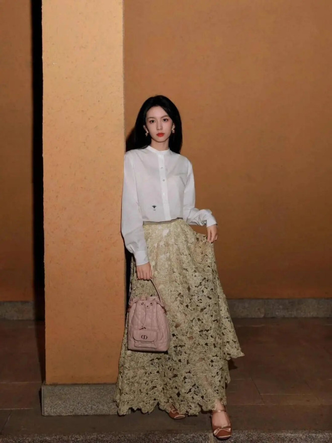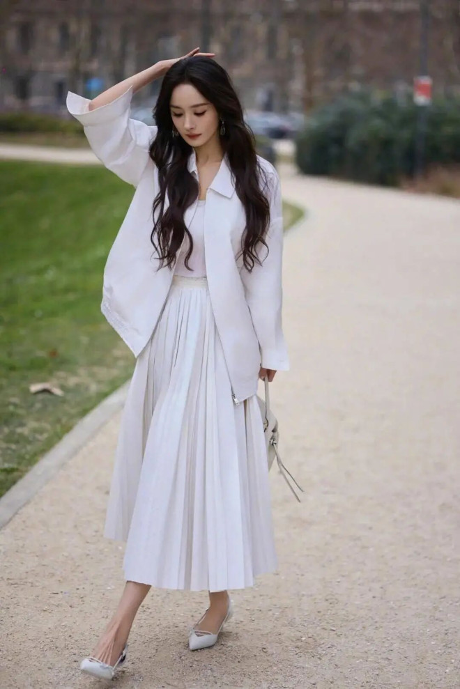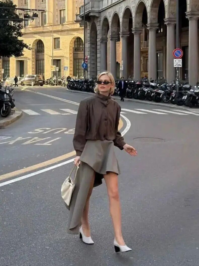 若是半裙偏素雅,就选带飘带、泡泡袖的衬衫,用小细节点亮造型,低调又有质感。