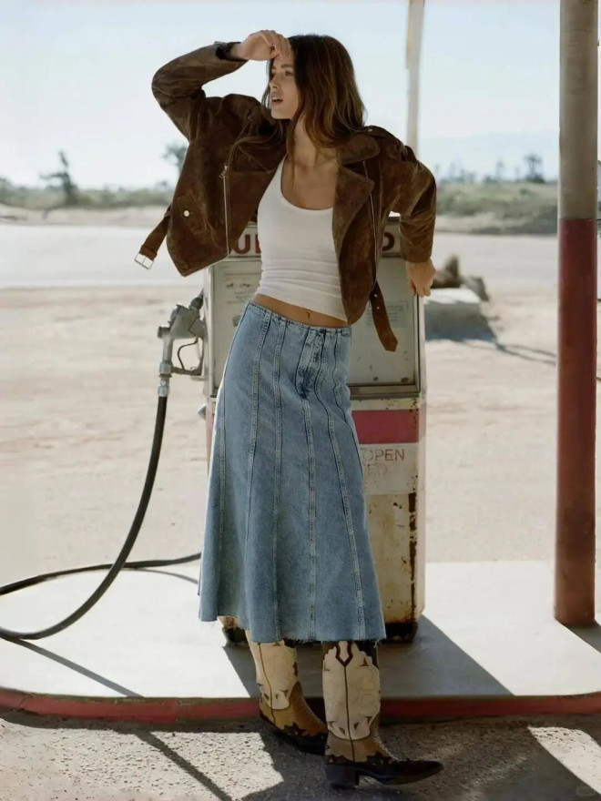 1、夹克+裙子:刚柔并济,又飒又美