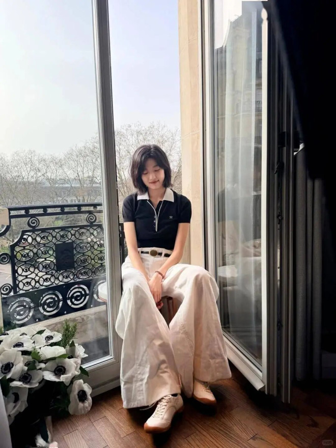 九分阔腿裤露出纤细脚踝,配乐福鞋、芭蕾鞋都很合适。