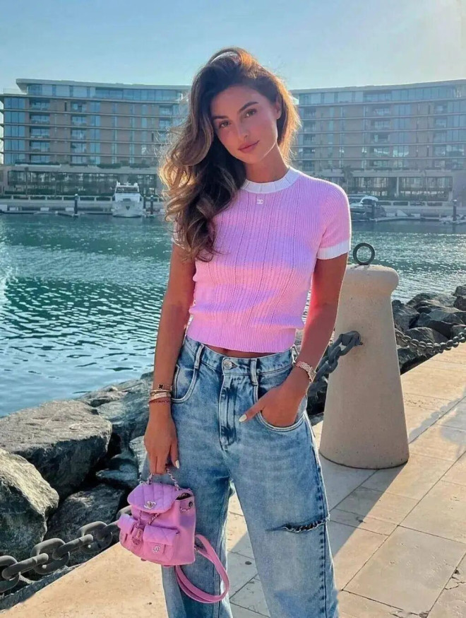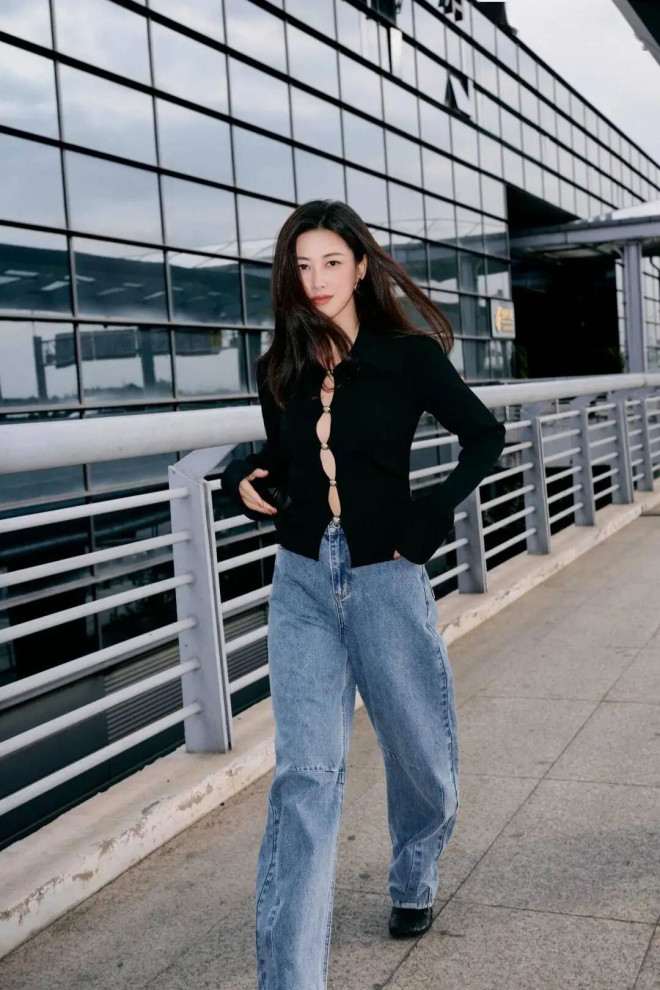 修身针织配高腰直筒牛仔裤,利落显身材。