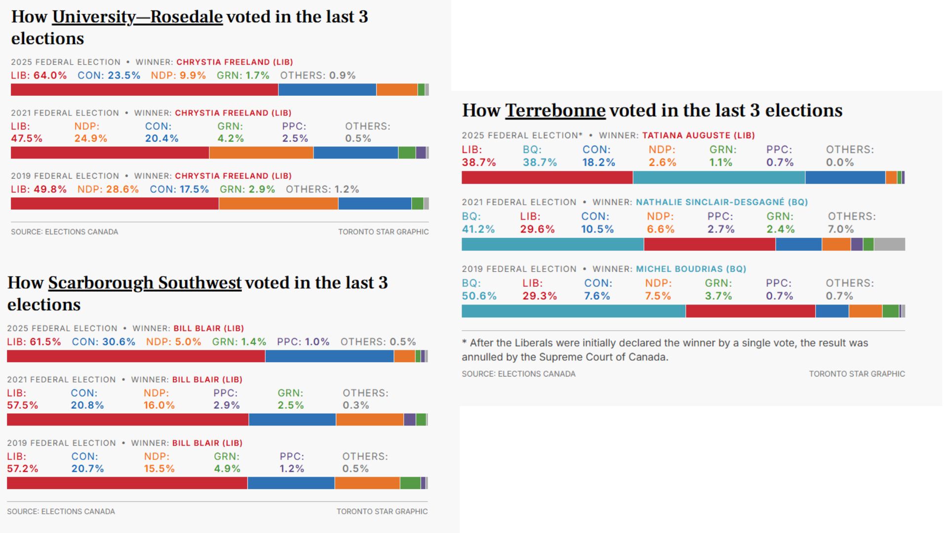 一般而言,补选不会具有如此重大影响,但今次在大学-玫瑰谷(University—Rosedale)、士嘉堡西南选区(Scarborough Southwest)及特雷博恩(Terrebonne)三个选区的选举,将直接影响卡尼政府能否弥补去年大选未能取得多数政府的遗憾。