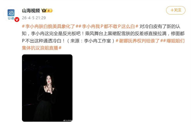 据4月5日报道,《乘风2026》初舞台排名一公布,50岁的李小冉凭借“白到发光”的皮肤状态,直接引爆了全网热议。