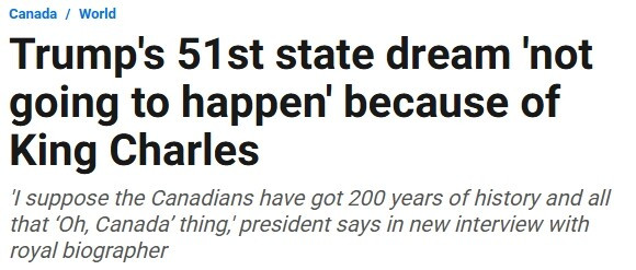 去年为伊丽莎白二世传记进行的采访时,川普曾向王室传记作家Robert Hardman提及,他过去多次声称加拿大应该并入美国,理由是加拿大在军事安全和贸易上依赖美国。不过,川普也坦言,在他剩余的总统任期内,让加拿大加入美国实际上不太可能实现。