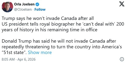 "加拿大的石油比美国多得多,淡水资源也更多,"卡尔森称,"我们最重要的盟友就是加拿大……加拿大发生的事情比什么都重要。也许我们应该试着对加拿大施加一些影响,不一定要用武力,但如果需要的话也可以。你可以说加拿大需要被'解放'。如果有哪个国家需要被政府'解放',那就是加拿大人。"