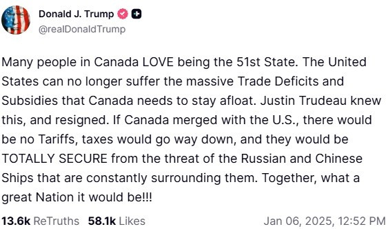 2025年1月,川普在Truth Social平台发文称:"很多加拿大人喜欢做第51州。"