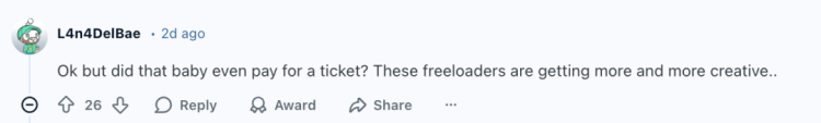 “好吧,但是那个婴儿到底有没有付票钱啊?这些蹭票的人真是越来越有创意了……”