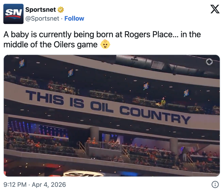 据 Daily Mail 报道,4 月 4 日(星期六)晚,一名埃德蒙顿油人队的女球迷在现场观看主队与维加斯金骑士队的 NHL 比赛时可能因为太过激动,直接临盆并在球馆生了个孩子。