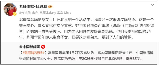 4月7日,富华国际集团发布讣告宣布陈丽华女士因病医治无效在京逝世,享年85岁。消息一出,不少网友立马联想到她的巨额遗产如何处置,二婚丈夫迟重瑞能分多少?
