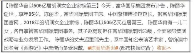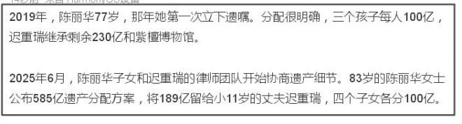 关于陈丽华的遗产状况,此前有爆料称她早在几年前就已经提前立了遗嘱,目的是防止子女争夺资产,传言称子女每人平分100亿,剩下的归属迟重瑞。根据讣告文,陈丽华名下拥有的核心财产主要有两处,一个是富华国际集团,她生前担任名誉主席,一个是中国紫檀博物馆,生前担任馆长。