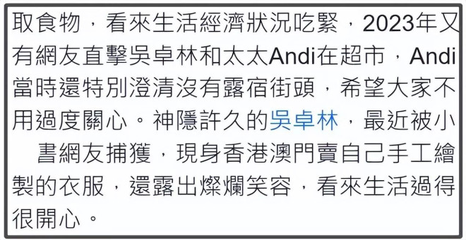 台媒报道称吴卓林曾被偶遇逛超市,身边人还澄清并没有露宿街头,2025年年底的时候,还有人偶遇吴卓林在夜市摆摊卖手绘衣服,也算是自己创业了。
