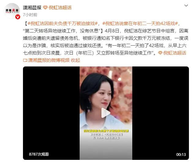 4月8日,倪虹洁在综艺节目中坦言,因离婚后突遭前夫遗留债务危机,被银行通知名下银行卡因欠款千万元被冻结,一度误以为是诈骗,核实后被迫通过接戏还债。