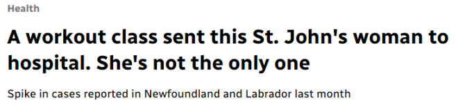 今年3月,纽芬兰与拉布拉多省卫生服务机构对该省部分地区年轻女性横纹肌溶解症病例激增发出警告。纽芬兰与拉布拉多省卫生服务机构提醒,高强度锻炼后,圣约翰等地越来越多年轻女性出现肌肉损伤。从去年10月至今年4月,该省东部地区(包括圣约翰)的急诊部门录得20例横纹肌溶解症病例——大多为19至30岁女性。