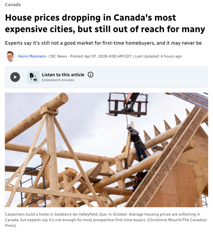 加拿大统计局的数据显示,经通胀调整后的实际小时工资中位数从 1981 年到 2024 年增长了 20%,而经通胀调整后的房价增长了 163.5%。